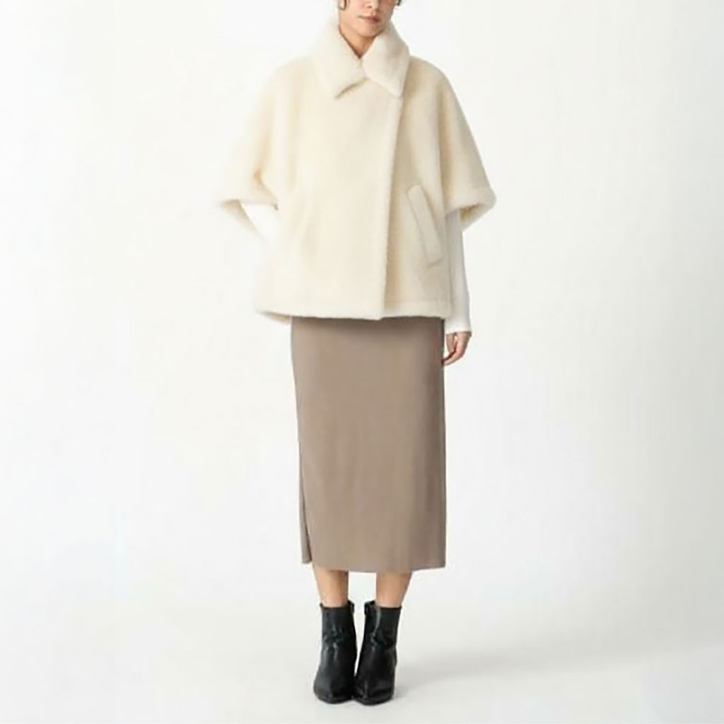 素材はTEDDYと同じ、アルパカ・ウール・シルクの上質ブレンド。羽織るだけで冬の着こなしがパッと明るく、柔らかく。