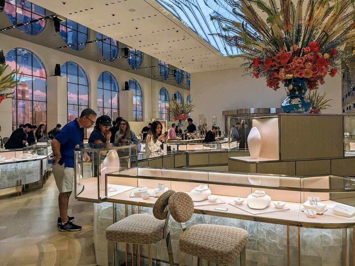 内装前のティファニーは、濃い色の木とメッキされた金属の色調で統一されていました。それが見て頂ける通り、床も壁も明るい色合いに現代的になっています。改装前に話題だったカフェは2階だそうですので、次回ゆっくり時間のある折に訪ねてご紹介しますね。