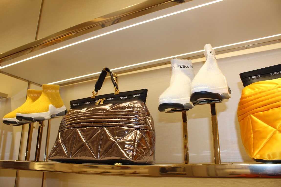 入って左側の棚には、奥にあったワンダーフルラのようなストリート系、スポーティなバッグとは対照的な、フルラ・べラリアが飾られています。