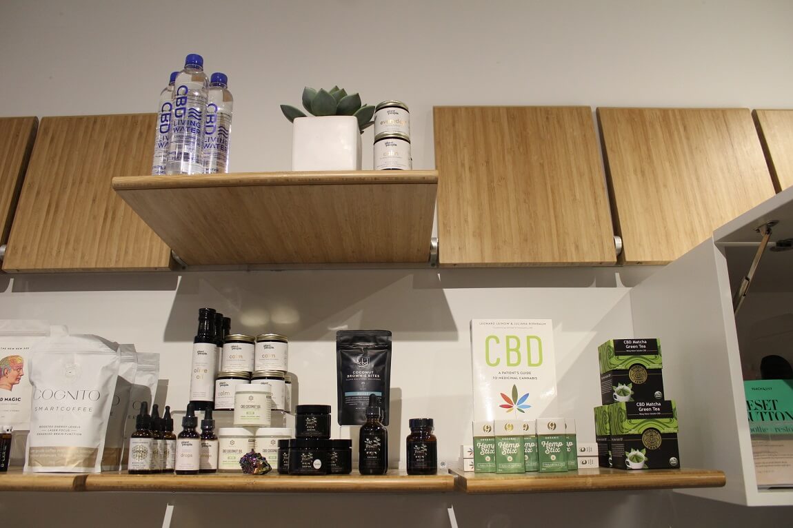 入口の右手にはさまざまなリラクゼーション用を促す製品や食品、本などが売られています。巷ではまだそれほど見かけないCBDオイル製品もたくさん種類があります。