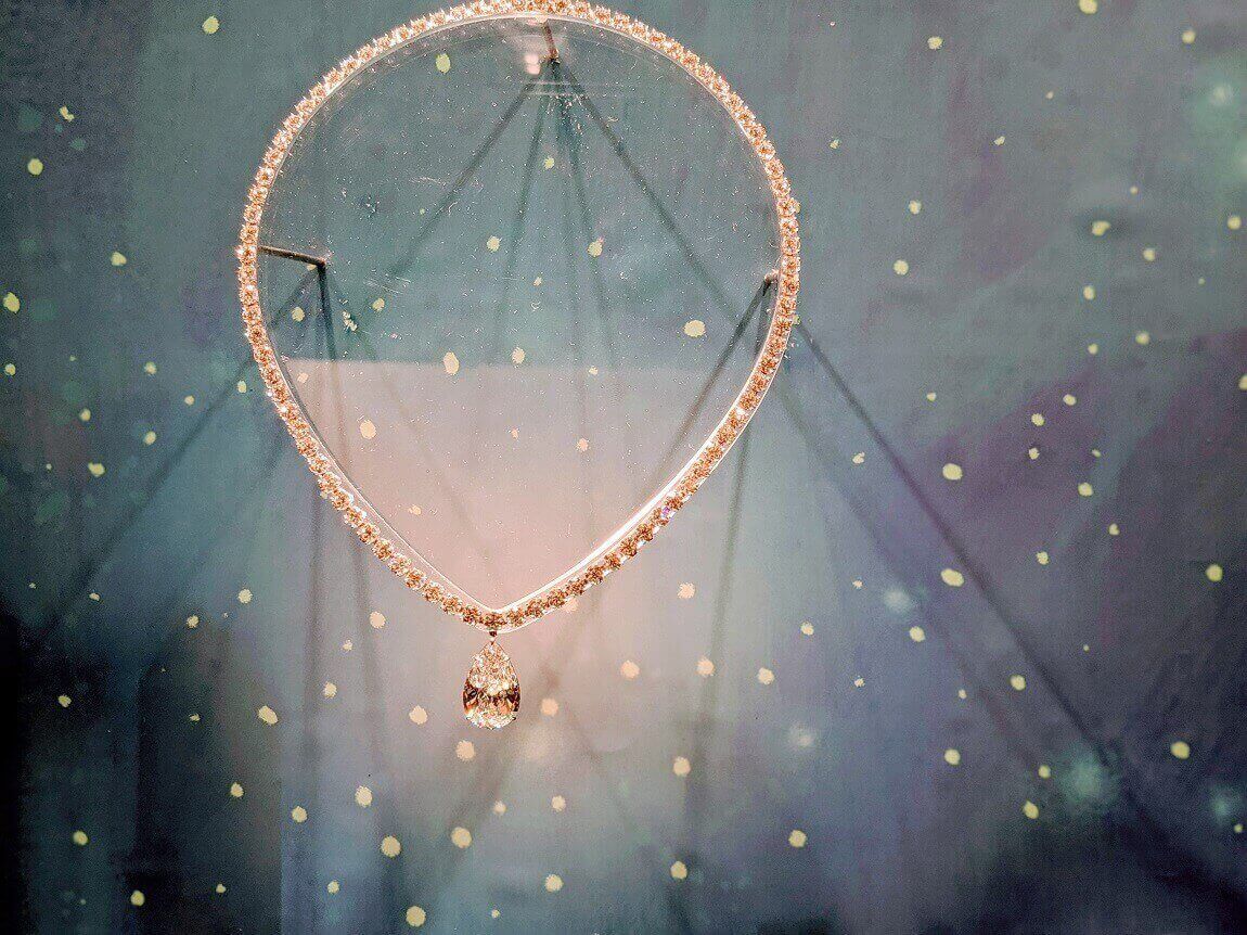 写真のティファニー・ネックレスは”スター誕生”とネーミングされていますが、首周りに輝く86ヶのダイアモンドのトータルカラット数が何と31カラット!それだけではありません。真ん中の梨の形のダイアモンドだけで11カラットあるんです。今年のクリスマスのティファニーを代表するこのネックレス、何と1.9ミリオンダラー(約2億円)の値段がついていて、まさに、スター誕生ですね。