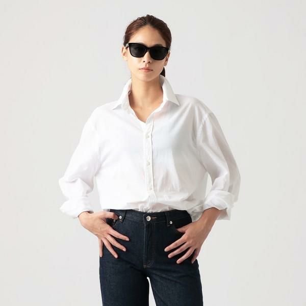 テンプルにメタルパーツを添えて、さりげなく高級感を演出。カラーレンズにはダークトーンを採用し、モードな雰囲気をプラスしました。やや厚みのあるフレームでインパクトがあり、着こなしのアクセントになってくれるのも魅力です。