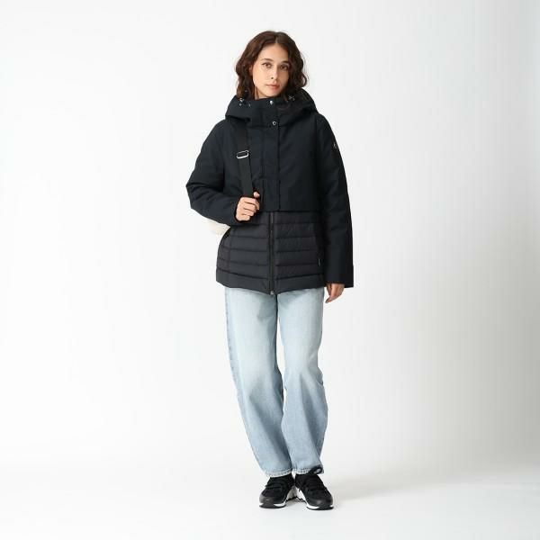 異素材の切り替えでメリハリを効かせたダウンジャケット。スタンドカラーにドローコード付きのフードなど、気の利いたディテールが魅力です。ウエストからの緩やかなAラインシルエットが、女性らしい雰囲気を演出。高い保温性を備えており、寒い時期の防寒対策に優れています。