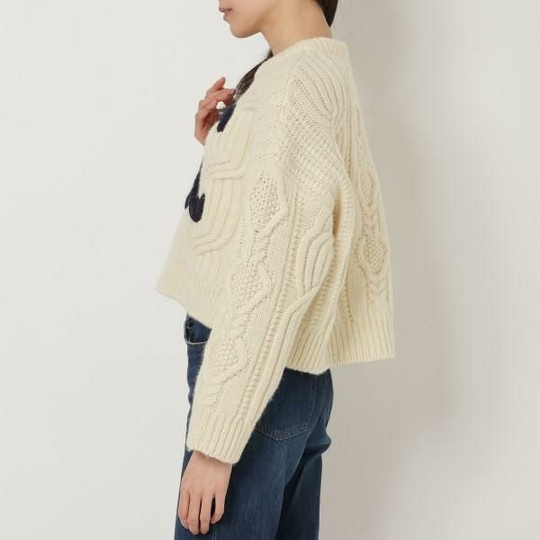 フロントに施した大きめのトリオンフ刺繍がアクセントになったニット。洗練された上質で厚みのある素材を使用しており、保温性を高めます。トレンドライクな短丈を採用しており、ワイドパンツやタイトスカートと合わせてもおしゃれに着こなせます。