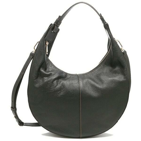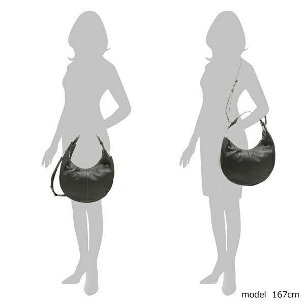 異素材を取り入れたデザインがファッショナブルなハーフムーン型のバッグ。重厚感のある色合いで品格を漂わせる一品です。開閉がスムーズなファスナー式の間口や内ポケットを備え、実用性もアップしました。