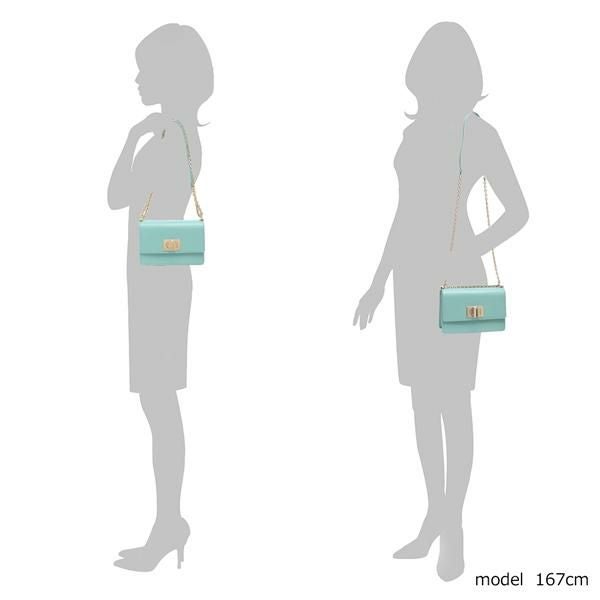 コーディネートに爽やかなイメージをプラスするカラーのショルダーバッグ。立体的なアーチロゴがおしゃれなアクセントになっています。スマートフォンやミニ財布など、お出かけに必要な荷物が収まるサイズ感です。