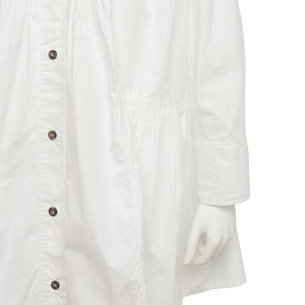 清潔感のあるクリーンカラーに大きめの襟がインパクトを与えるデザイン。前後にギャザーを取り入れて、華やかな雰囲気に仕上げました。お尻周りをカバーする長めの着丈も嬉しいところ。細身のパンツと合わせるコーデもおすすめです。
