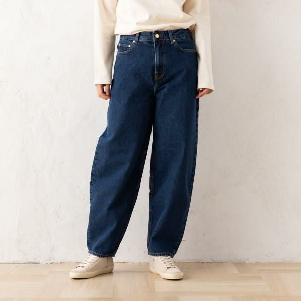 ボリュームのあるシルエットが特徴のデニムパンツ。落ち着いた色合いが大人の魅力を感じさせます。後ろポケットに施したロゴ入りのパッチがアクセントに。トレンドライクな短丈トップスと合わせると、バランス良く着こなせます。