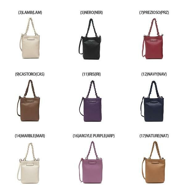| カラー | (3)LAMB(LAM) ベージュ (5)NERO(NER) ブラック (7)PREZIOSO(PRZ) レッド (9)CASTORO(CAS) ブラウン (11)IRIS(IRI) パープル (12)NAVY(NAV) ネイビー (14)MARBLE(MAR) ホワイト (16)ARGYLE PURPLE(ARP) パープル (17)NATURE(NAT) ベージュ (18)PHARD(PHA) ベージュ (20)ANCIENT WATER(ANW) ブルー (21)ARTICO(ARTICO) ブルー (22)LILAC(LIL) パープル (24)DEEP GREEN(deg) グリーン (27)LIMO(lim) ブラウン |