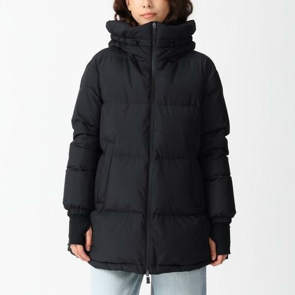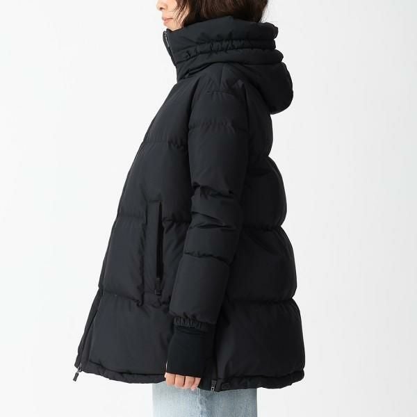 太めのキルティングデザインに、裾にかけて広がるAラインシルエットが特徴です。防寒性を高める袖口のインナーカフや、大きめのフード付きもポイント。スカートからパンツスタイルまでバランス良く着こなせる1着です。
