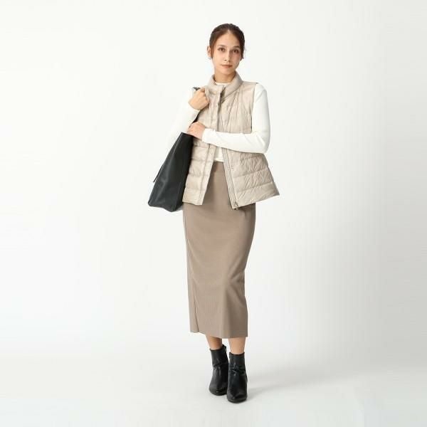上品な生地の光沢感が目を引く1着。ウエストは程よくシェイプしており、すっきりとしたシルエットです。両サイドにはポケットを備え、使い勝手の良さにもこだわりました。落ち着いた色合いで、さまざまなスタイリングにバランス良くマッチします。