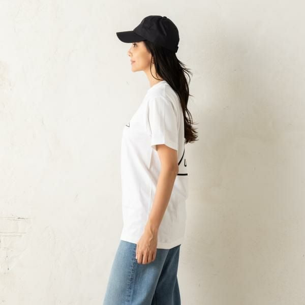 落ち着いたカラーに、トライアングルロゴがアクセントになったデザイン。肌当たりの良い柔らかい素材感で、着心地も良好です。ベーシックなクルーネック仕様で、幅広いボトムスにマッチ。ユニセックスで着用できるのも嬉しいポイントです。