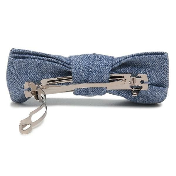 デニム素材のリボンモチーフに輝きを放つメタルモチーフをあしらいました。カジュアルからきれいめまで幅広いコーディネートに合わせやすいデザイン。いつものヘアスタイルに加えるだけで、一気に華やかさがアップします。大切な方へのプレゼントにも喜ばれる一品です。