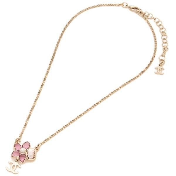 優しいカラーのフラワーモチーフにストーンパーツを合わせました。目立ちすぎないシンプルなCCマークもポイント。細めのチェーンがデコルテラインに馴染み、アクセントを添えます。特別感があるため、大切な方へのギフトにもおすすめです。