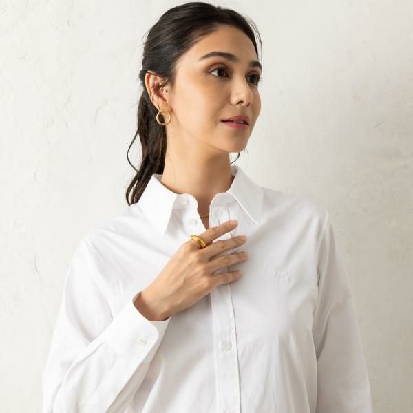 シンプルながら厚みのあるシルエットが存在感を主張。さりげなく刻印されたブランドロゴが高級感を漂わせます。ブレスレットやネックレスなど、ほかのアクセサリーと色味を合わせたコーディネートがおすすめです。