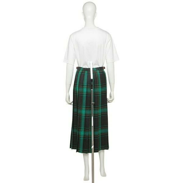 ブリティッシュな雰囲気のチェック柄が、装いに個性を添えてくれます。後ろに大胆なプリーツを施し、女性らしいシルエットを演出。ウエストはスッキリとしたデザインで、ベルトがアクセントになっています。優しい印象と温かみを感じられる1枚なので、ニットやカーディガンと合わせたコーディネートがおすすめです。