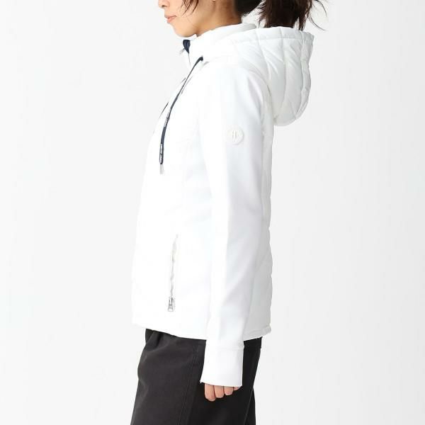 顔周りをパッと明るくするクリーンカラーが魅力です。異素材ミックスや、ロゴ入りのドローコードを備えたフードでメリハリをプラス。動いたときに袖がずり上がるのを防ぐサムホール付きも嬉しいポイントです。