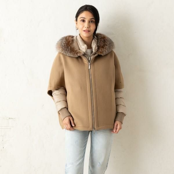 コーディネートに取り入れやすいソフトなカラーで、幅広い年代の方におすすめ。ケープとダウンジャケットを組み合わせており、セットでの着用はもちろんそれぞれ単体でも活躍してくれます。寒い季節のワードローブに揃えておきたいアイテムです。