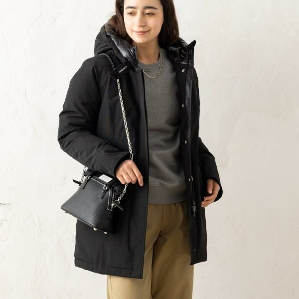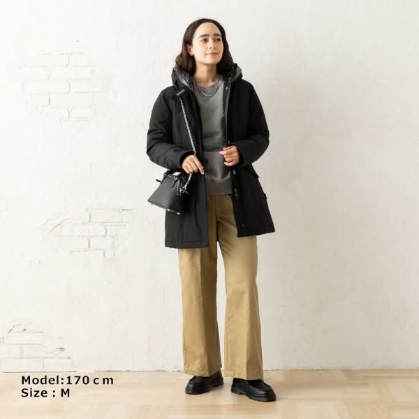 裾にかけて程よく広がるAラインシルエットのダウンコート。腰周りが隠れるミドル丈に、フワッとしたボリューム感のあるフードが特徴です。高い保温性を備えており、寒い時期の防寒対策に優れています。