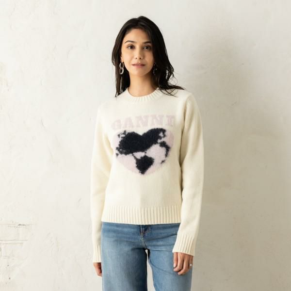 フロントにあしらったハートとロゴが印象的なニット。肌触りの良いやわらかい素材感で、快適な着心地をキープします。首元、袖口、裾はリブ仕様で、カジュアルな雰囲気をプラス。スカートからパンツまで、さまざまなボトムスと好相性です。