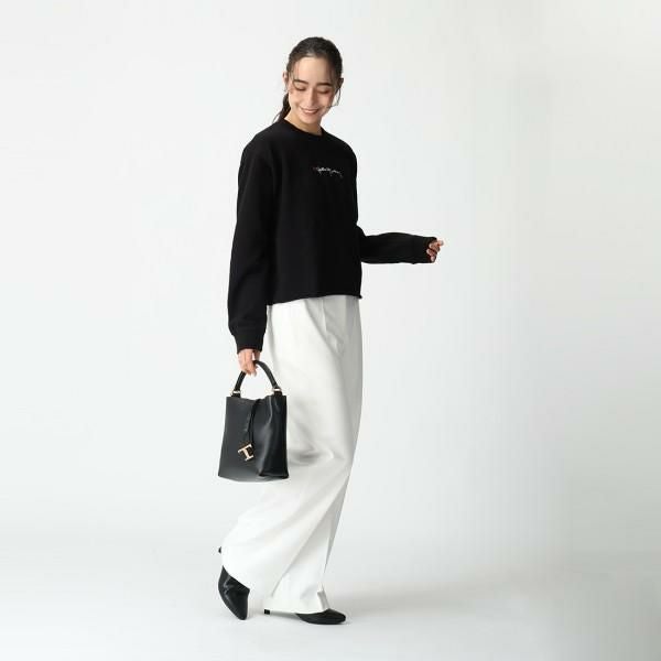 フロントにあしらった、かわいらしいロゴ刺しゅうが目を引くデザイン。ベーシックな色使いで着回しやすく、スカートとパンツどちらにもマッチします。柔らかな肌触りで着心地もよいので、ご自宅でのリラックスシーンなど、様々なシーンで着用したくなるアイテムです。