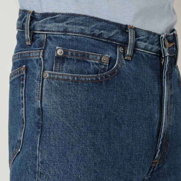 深みのある色合いにベーシックなシルエットのデニムパンツ。洗練されたこなれ感のある風合いで大人の魅力を発揮します。様々なトップスに合わせやすいシンプルなデザインで、ワードローブにあると重宝します。