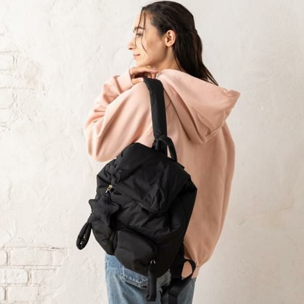 シンプルながらぷっくりとしたシルエットが印象的なデザイン。内外に複数のポケットを備えており、かさばる荷物をきれいに整理できます。普段使いからレジャーまで様々なシーンでお使いいただけます。