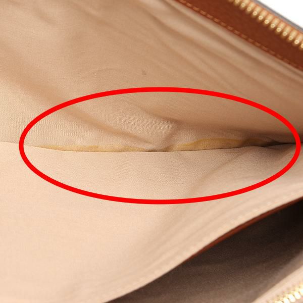 ファスナーの縫い付けが甘くなっております。内側布部分の底にしみがございます。(写真 赤丸部分)