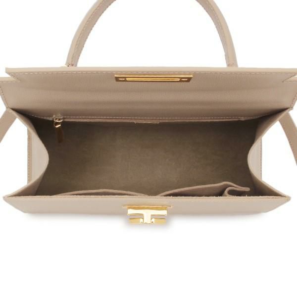 クラシカルな雰囲気が漂う台形フォルムのハンドバッグ。煌めくメタルパーツを配して、高級感を演出しました。ミニ財布や、スマートフォンなどの必需品が収納可能。取り外しできるショルダーストラップ付きなので、気分やシーンに合わせて持ち方を変えられます。