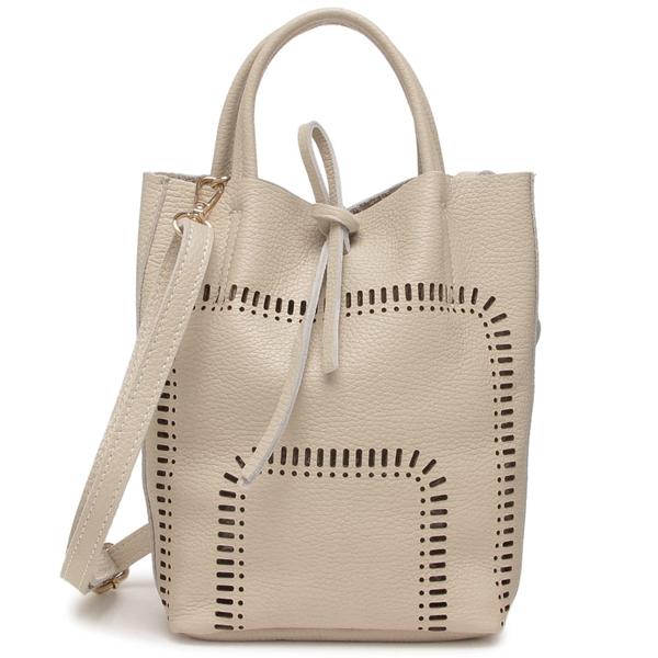 フロントのパンチングデザインが目を引く、上品なハンドバッグです。すっきりとしたスクエア型のフォルムで、シーンを問わずに幅広く活躍します。コンパクトなサイズ感ながら、マチ付きで見た目以上に収納力があるのもうれしいところ。細々とした小物の整理整頓に重宝する、便利なポーチも付属しています。