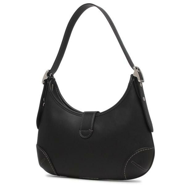 三日月のような丸みを帯びたフォルムで、装いのアクセントとなります。ベルトデザインとメタリックの金具が高級感あふれるポイント。ショルダーの長さを変えることでハンドバッグとしても活躍します。どんなスタイリングにも合わせやすく、幅広いシーンに重宝する一品です。