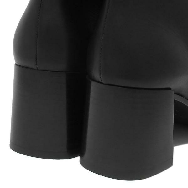 上質でツヤのある素材が高級感を漂わせます。サイドにトライアングルロゴを配し、ブランドらしさをアピール。クラシカルで清楚なイメージを与えるスクエアトゥもポイント。サイドジッパーで簡単に着脱できるのも嬉しいところです。