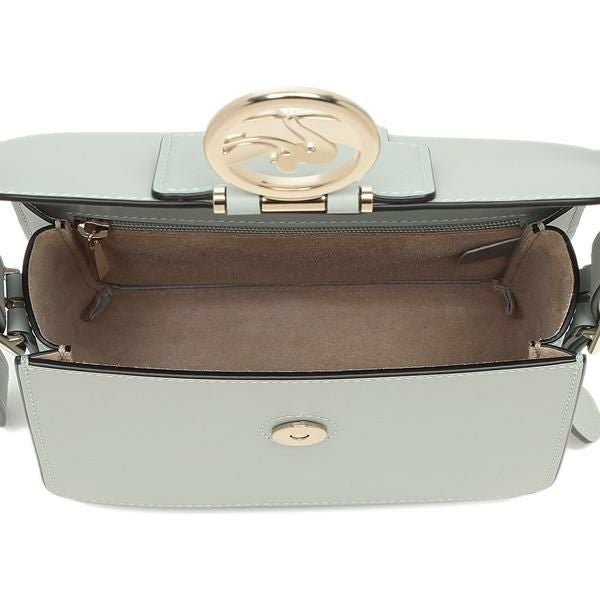 かっちりとしたスクエアフォルムのショルダーバッグ。フラップに配したメタルモチーフがリッチな魅力を感じさせます。開閉はマグネットボタン式で中の荷物をさっと出し入れ可能。長さ調節できるショルダーストラップ付きも嬉しいポイントです。