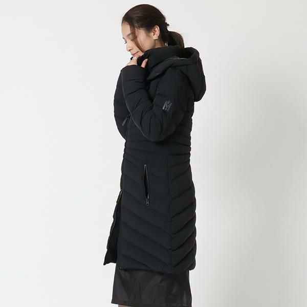 首元までしっかり覆うスタンドカラーで防寒性を高めたダウンジャケット。ウエストを絞ったシルエットで品があり、女性らしい印象で着こなせます。左袖にはロゴを施しさりげないブランドアピールを実現。幅広い年代の方におすすめの1着です。