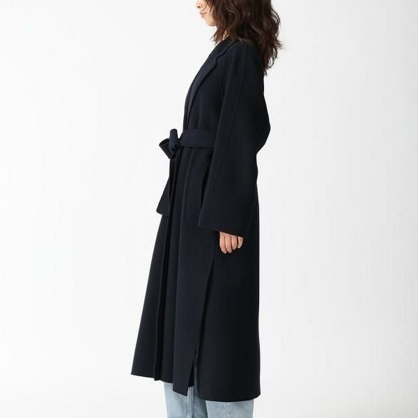 洗練された上質な風合いあふれるコート。長めの丈感なので、さっと羽織るだけで大人の雰囲気を演出できます。ウエストには共布ベルトが備わっているため、気分に合わせてスタイリングのアレンジをお楽しみいただけます。