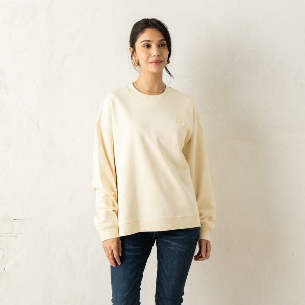 顔周りを華やかにするカラーリングが魅力のスウェット。ベーシックなクルーネックタイプで、着回し力に優れています。袖の異素材切替えや、胸元のロゴなど気の効いたディテールもポイント。スカートからパンツまで、幅広いボトムスと好相性です。