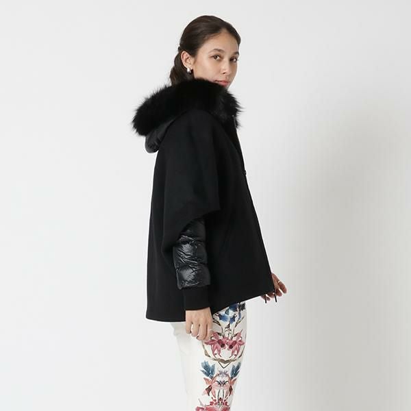 ケープとダウンジャケットを組み合わせており、セットでの着用はもちろんそれぞれ単体でも活躍してくれます。落ち着いた色合いながら、フードのふわふわとした風合いが華やかさを演出。どちらも上下から開閉できるダブルファスナータイプです。