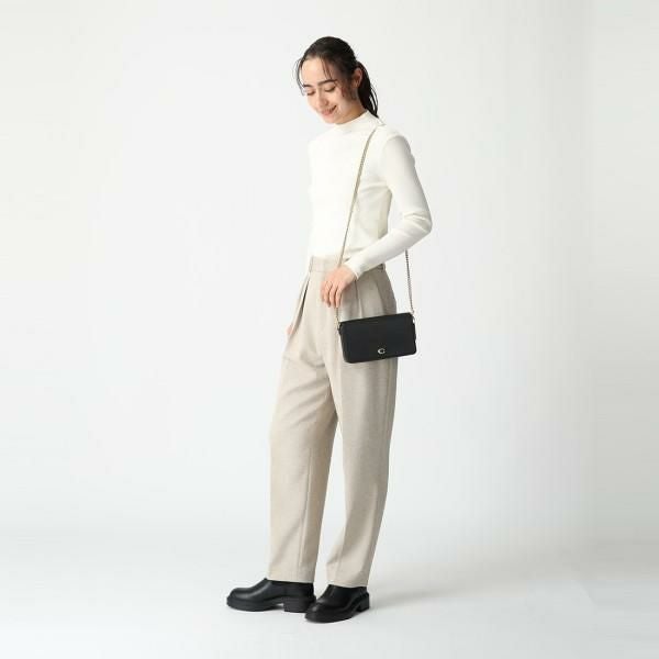 上質なレザーとキャンバス生地を組み合わせた、品格漂うデザイン。シンプルなフォルムにメタルロゴを添え、ブランドらしさをアップしました。カードスロット付きのポーチや多機能ポケットで、小物を整理して収納が可能。付属のチェーンストラップをつければ、肩掛けや斜め掛けでもお使いいただけます。