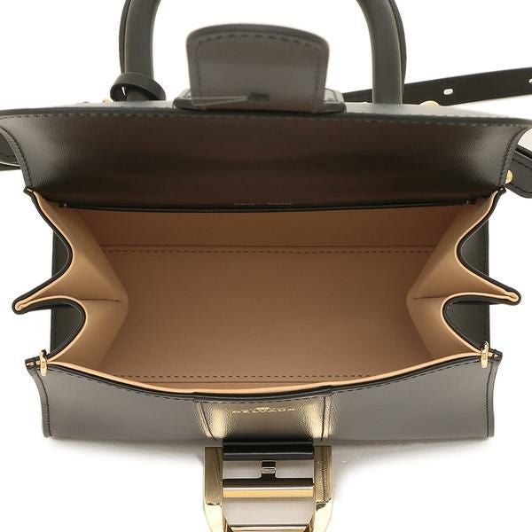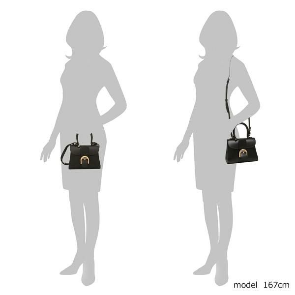 なめらかでツヤのある上質な風合いが際立つハンドバッグ。遊び心のあるフラップデザインに、アイコニックな馬蹄型のバックルがアクセントになっています。さっと身だしなみを整えたい時にも安心のバニティミラー付き。タウンユースから、セレモニーシーンにも重宝します。