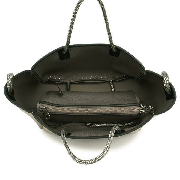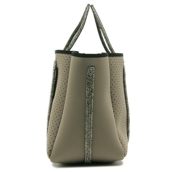 パンチングの効いた布地を2面にあしらい、リズミカルなデザインに仕上げました。ロープライクなハンドルとショルダーストラップはカジュアルさをプラスするアクセント。しっかりとマチのある設計で、見た目以上の収納力を備えています。