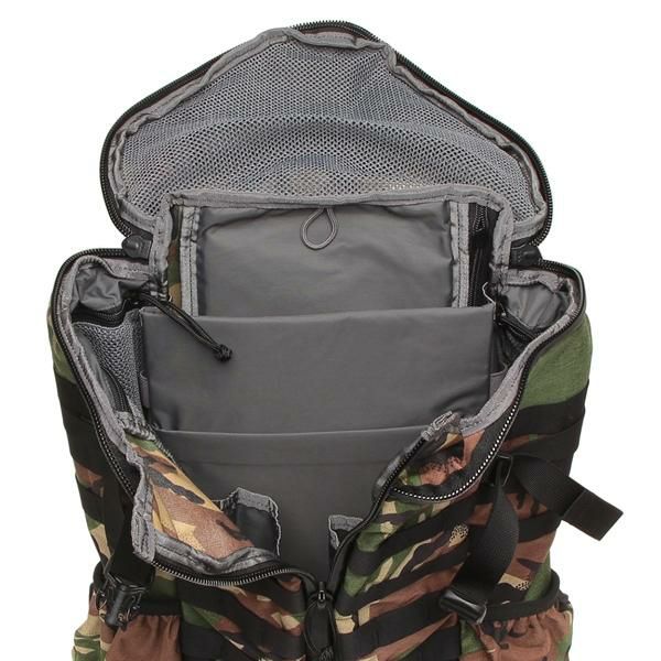高い収納力を備えた機能的なリュック。カモフラージュ柄を全体にあしらい、インパクトのある印象に仕上げました。ノートPCが収まるクッション性のある収納スペース、小物やボトルが入る豊富なポケットをセット。トラベルシーンや登山などにおすすめです。