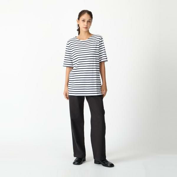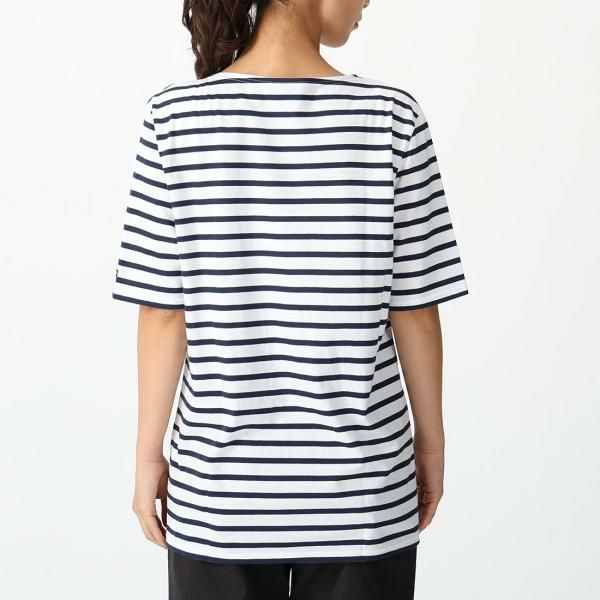 ブランドらしさ香る爽やかなボーダーデザインで、清潔感のある佇まいを叶える1着。さらりとした生地のため肌離れも良く、汗ばむ季節にも活躍してくれます。クルーネック仕様で汎用性も高く、ワードローブに備えておくと重宝するアイテムです。