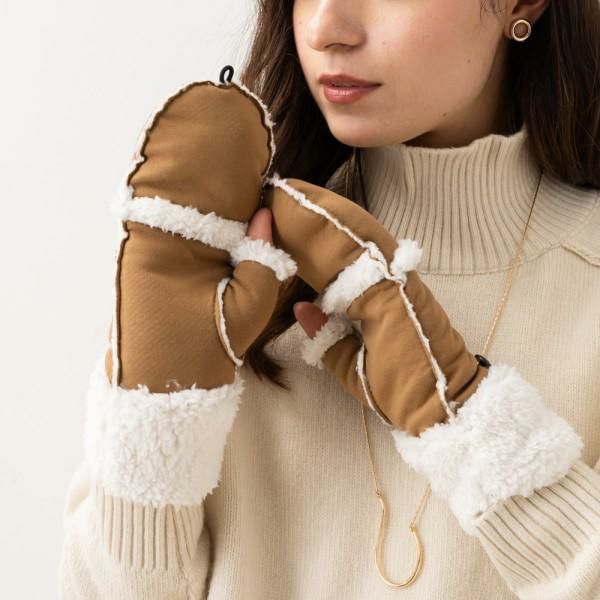 可愛らしいミトンタイプのグローブ。折り返し、切替部分と内側はモコモコのボア生地で保温性に優れています。指先部分をメタルボタンに引っ掛けるとフィンガーレスになるのもポイント。ご自分用としてはもちろん、ギフトにも喜ばれます。