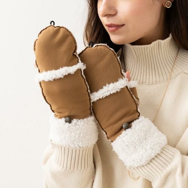 可愛らしいミトンタイプのグローブ。折り返し、切替部分と内側はモコモコのボア生地で保温性に優れています。指先部分をメタルボタンに引っ掛けるとフィンガーレスになるのもポイント。ご自分用としてはもちろん、ギフトにも喜ばれます。