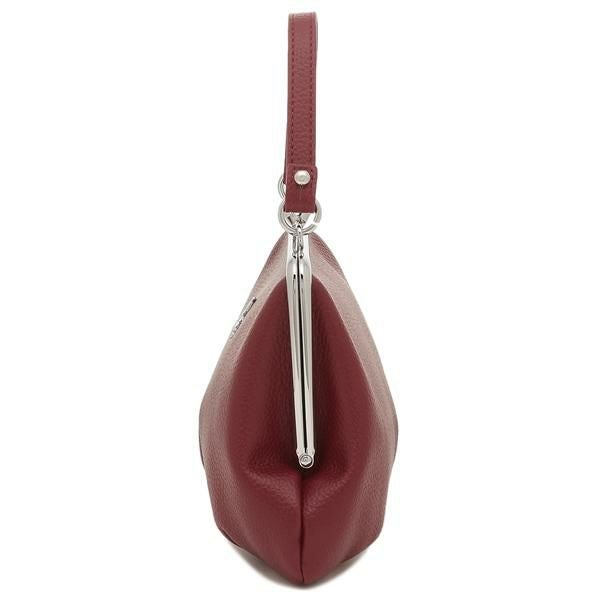 女性らしいエレガントなカラーにメタルオーブが美しく引き立ちます。開閉はがま口式で大きく開き、スムーズに出し入れ可能。チェーンストラップ付きなので、装いや気分に合わせて持ち方を変えられます。