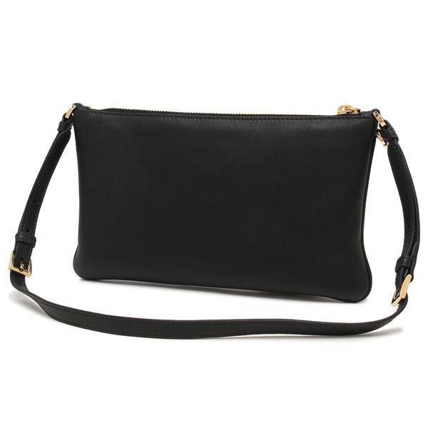フロントに配したトライアングルロゴが目を引く一品。メタルカラーの配色がラグジュアリーな印象をアップさせています。間口はファスナー仕様で、中身が飛び出しにくいのも嬉しいポイント。内部にはポケットを備えており、中身の整理に役立ちます。