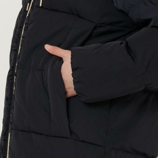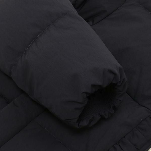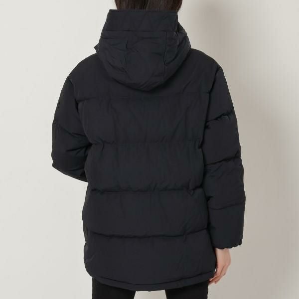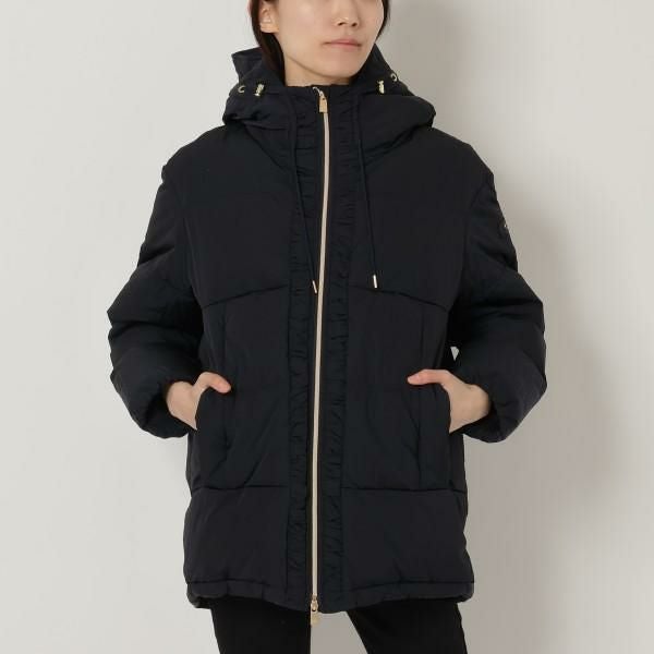 軽量でハリのある生地感が魅力のダウンジャケット。ダブルジップ開閉で、簡単に着脱できるのも嬉しいポイントです。小顔効果の高いフード付きに加え、裾部分にドローコードをセットしており、お好みのフィット感に調節できるデザインです。