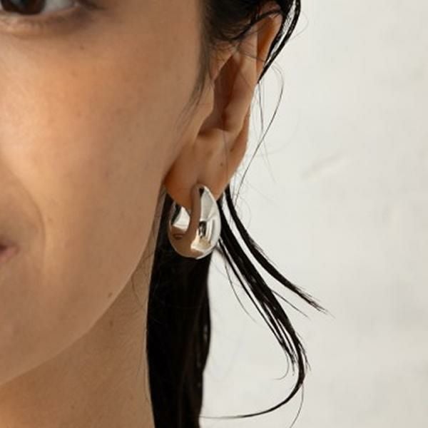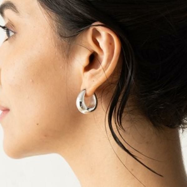 耳元で存在感を発揮するフープ型のピアス。ぷっくりとしたシルエットが可愛らしいデザインです。合わせるコーディネートを選ばず、色々なシーンにお使いいただけるメタルカラーもポイント。贈り物としても喜ばれるアイテムです。